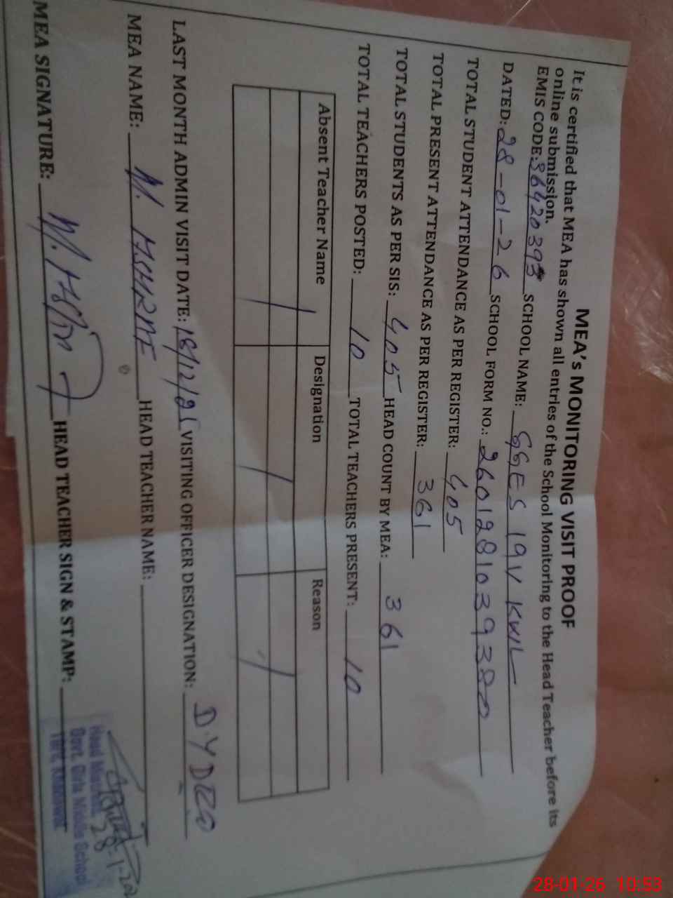 | Attendance Register | Head Teacher | MEA with School | Visit Proof |