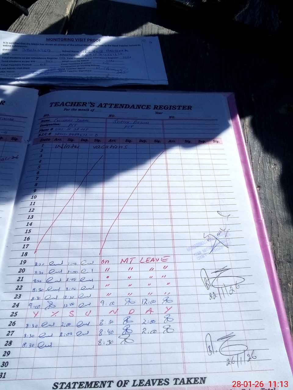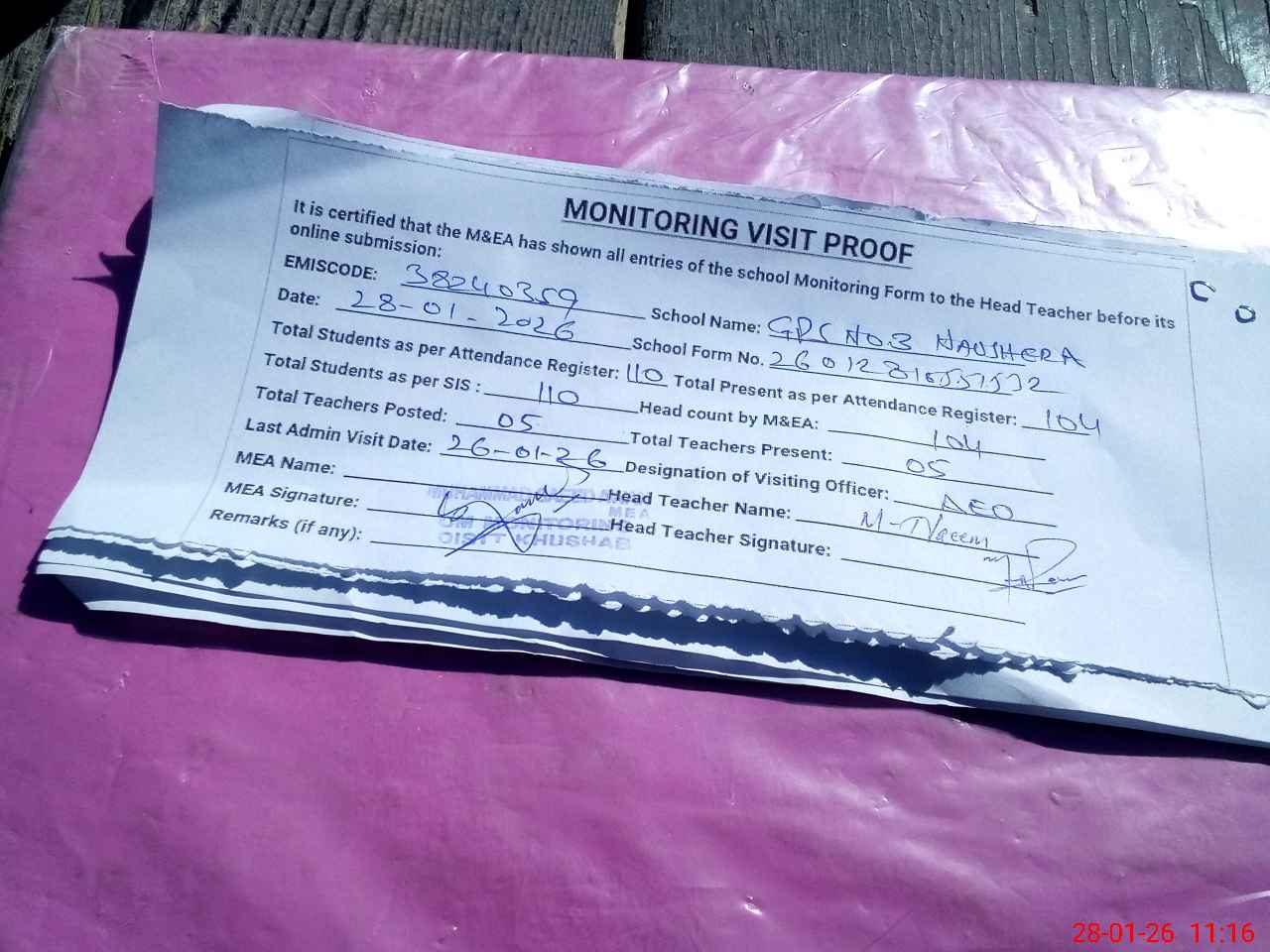 | Remarks (Use Separate Page if Required): Students on SIS Qty 110 Last admin visit On 26 January 2026 by AEO | |||||