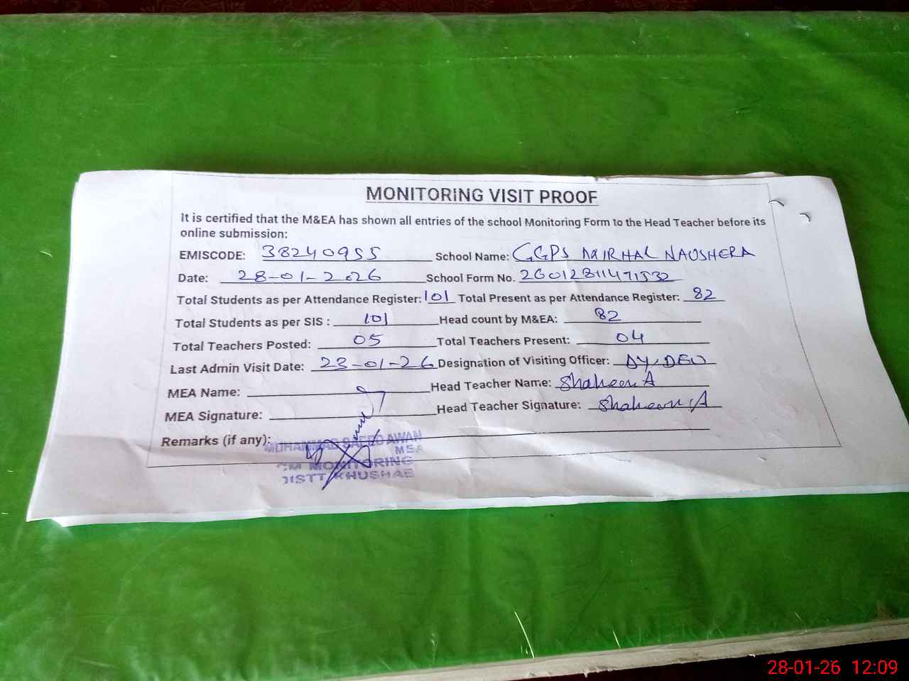 | Remarks (Use Separate Page if Required): Students on SIS Qty 101 Last admin visit On 23 January 2026 by Dy.DEO | |||||