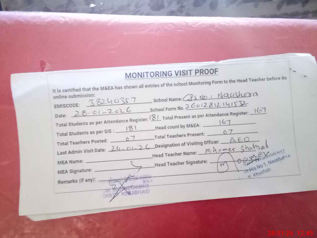 | Remarks (Use Separate Page if Required): Students on SIS Qty 181 Last admin visit On 24 January 2026 by AEO | |||||