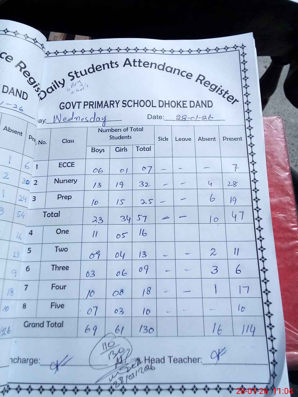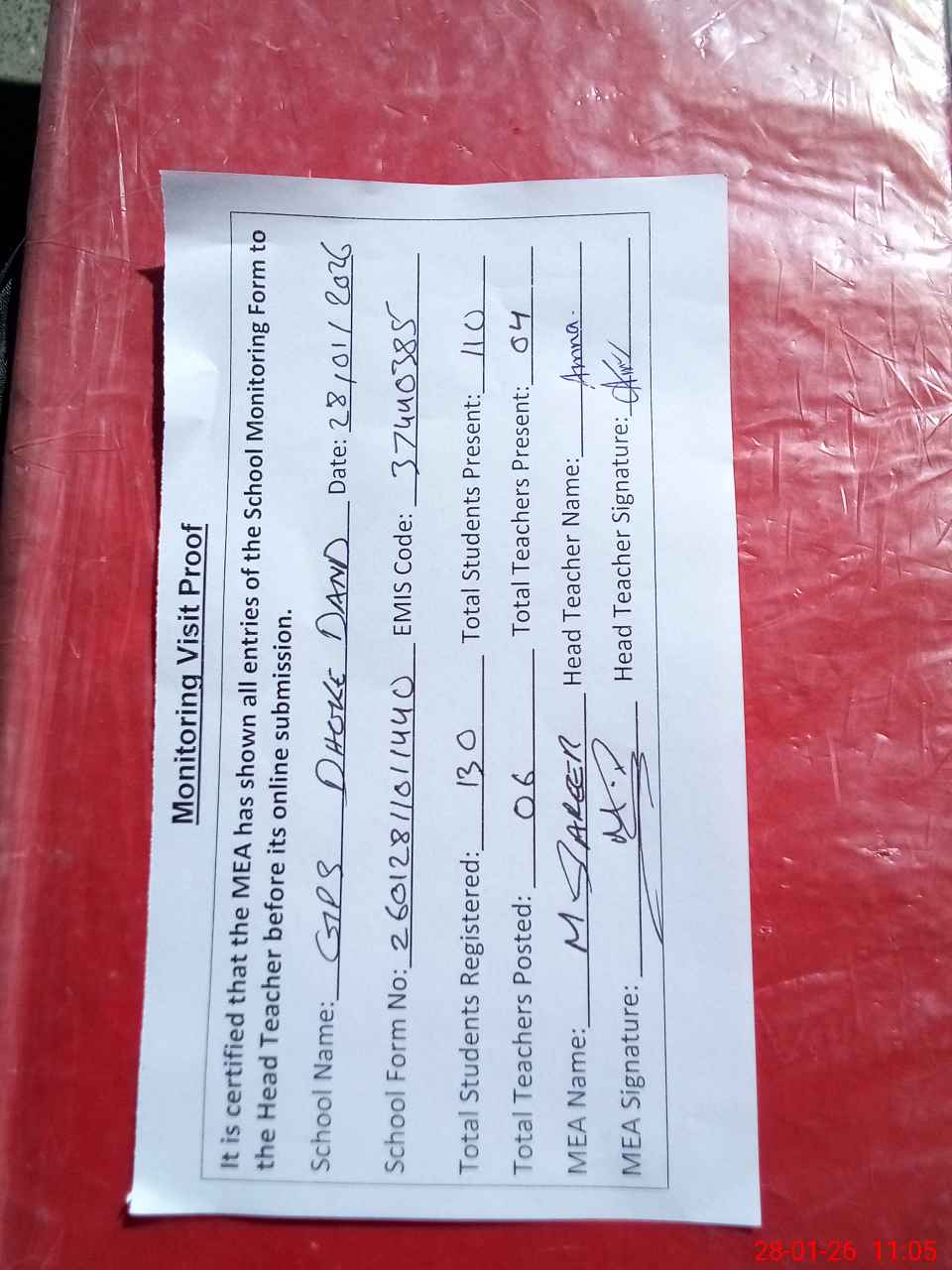 | Attendance Register | Head Teacher | MEA with School | Visit Proof |