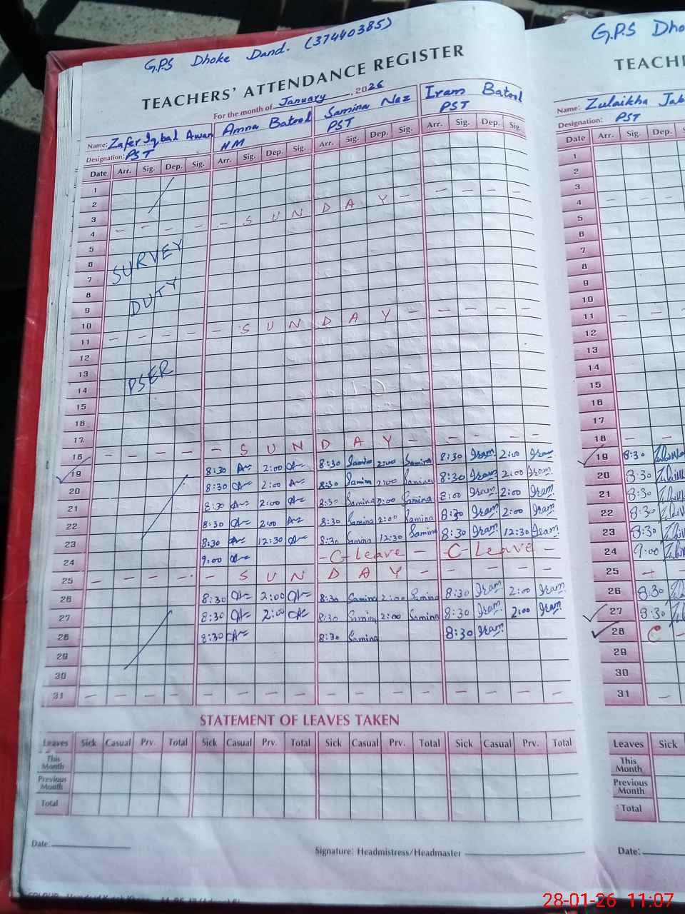 | Name: Za**** Iq**** Ae**** Designation: (School Headmaster's/Headmistress's) PST Phone/Cell Number: 03**** |