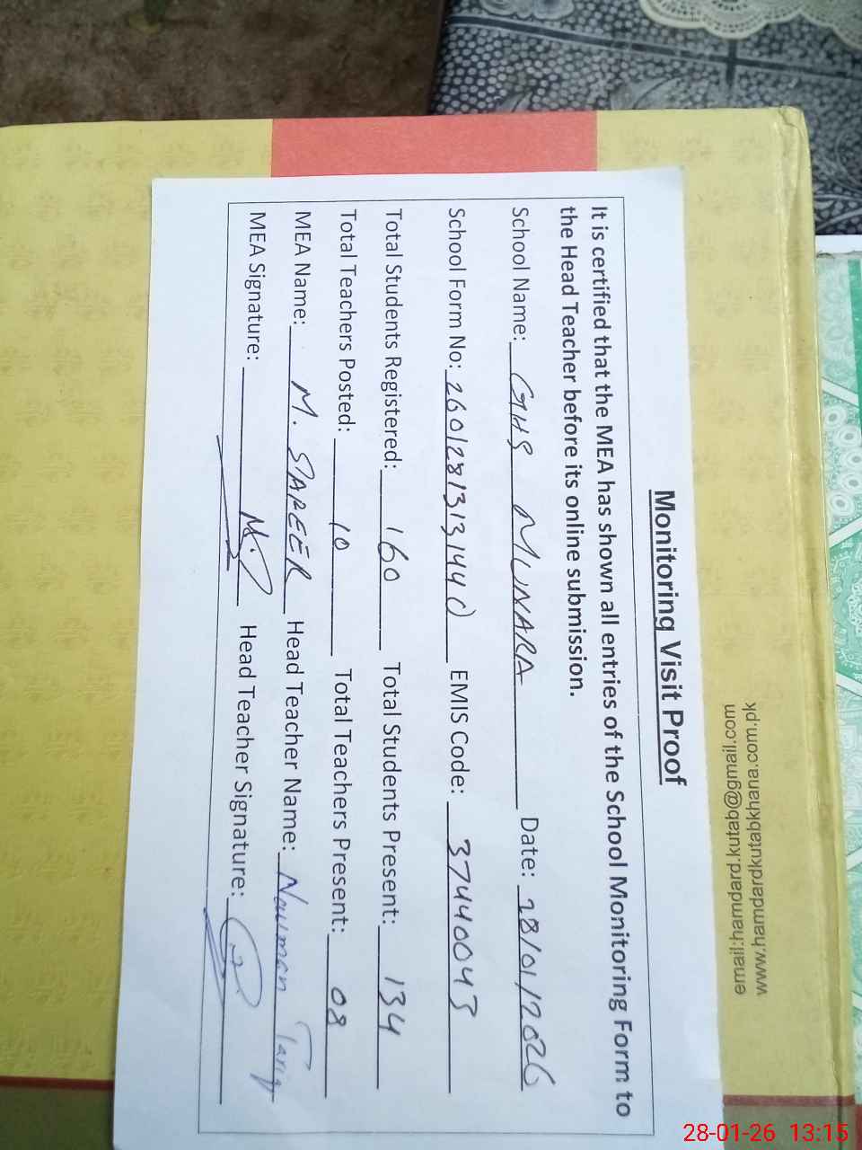 | Attendance Register | Head Teacher | MEA with School | Visit Proof |