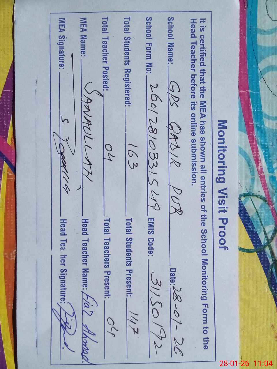 | Attendance Register | Head Teacher | MEA with School | Visit Proof |