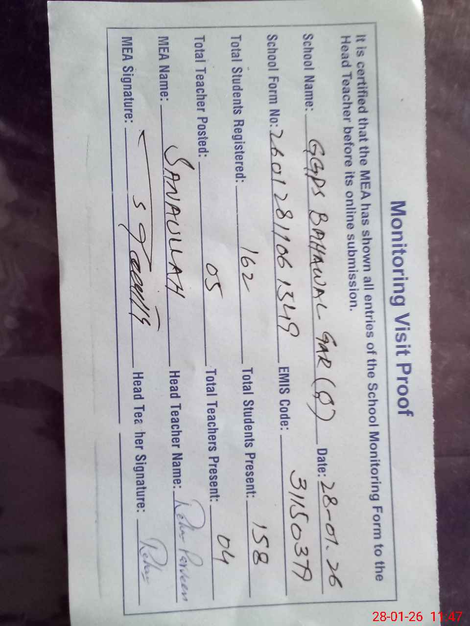 | Attendance Register | Head Teacher | MEA with School | Visit Proof |