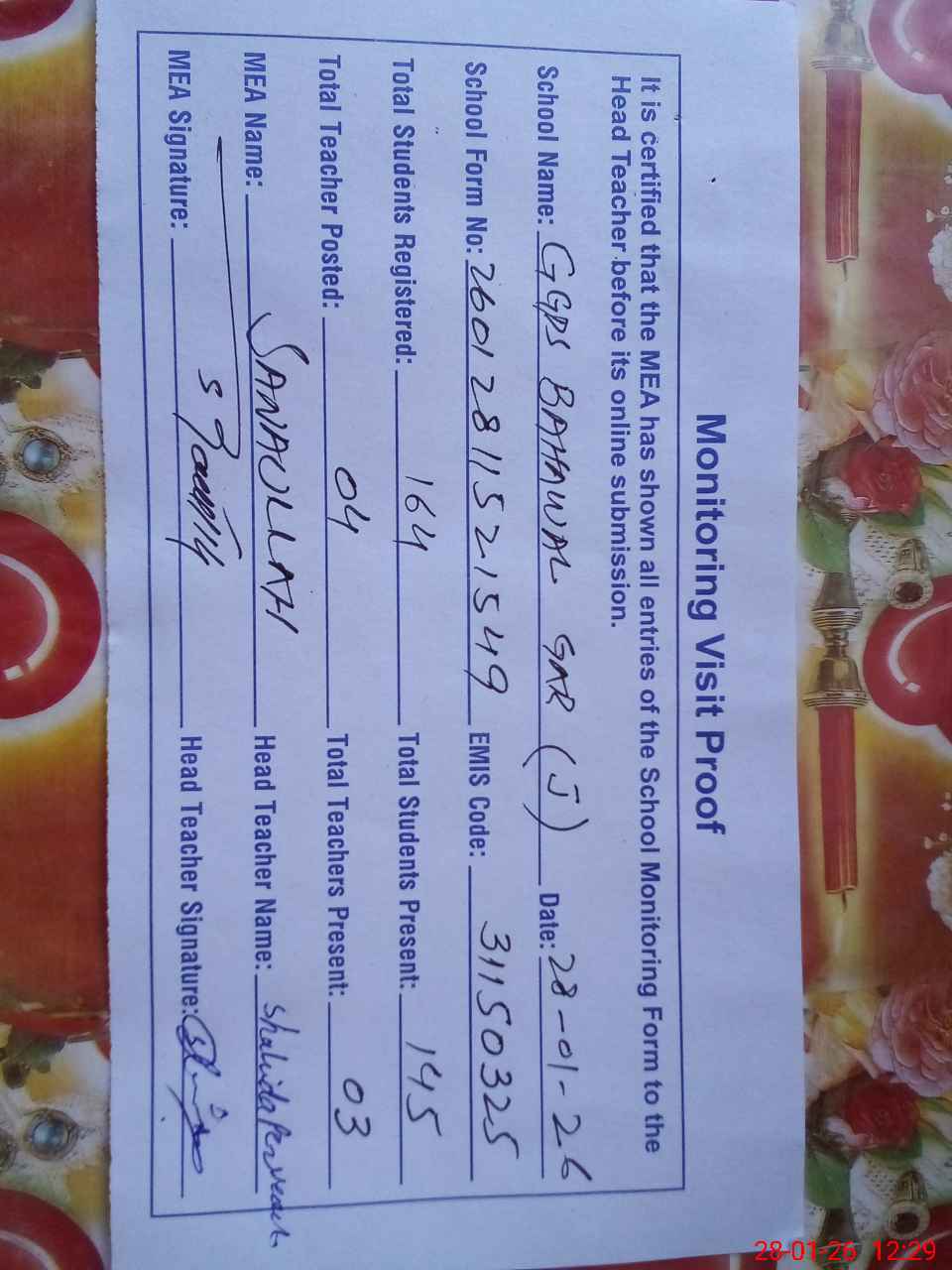 | Attendance Register | Head Teacher | MEA with School | Visit Proof |