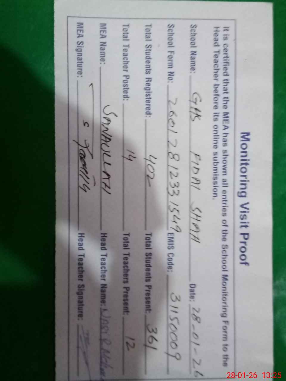 | EMIS Code: 31150009 | Name of School: GHS FIDAI SHAH | |||