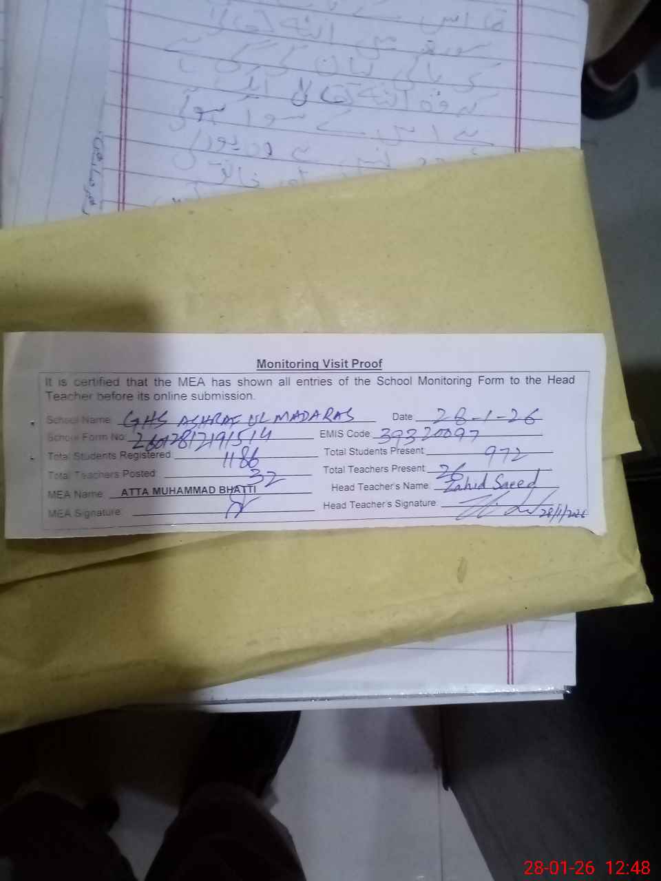 | Attendance Register | Head Teacher | MEA with School | Visit Proof |