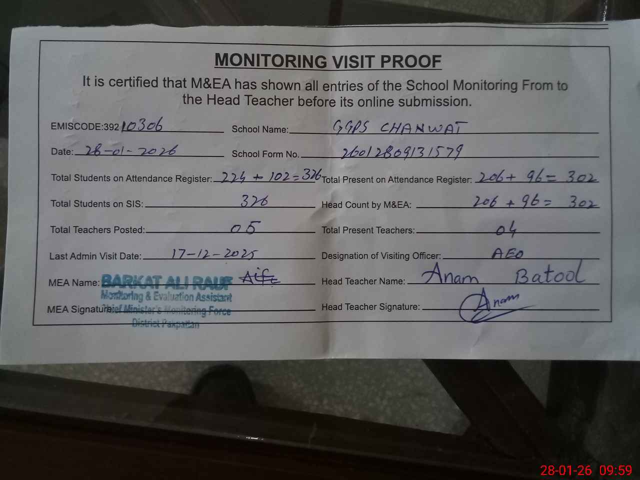 | Attendance Register | Head Teacher | MEA with School | Visit Proof |