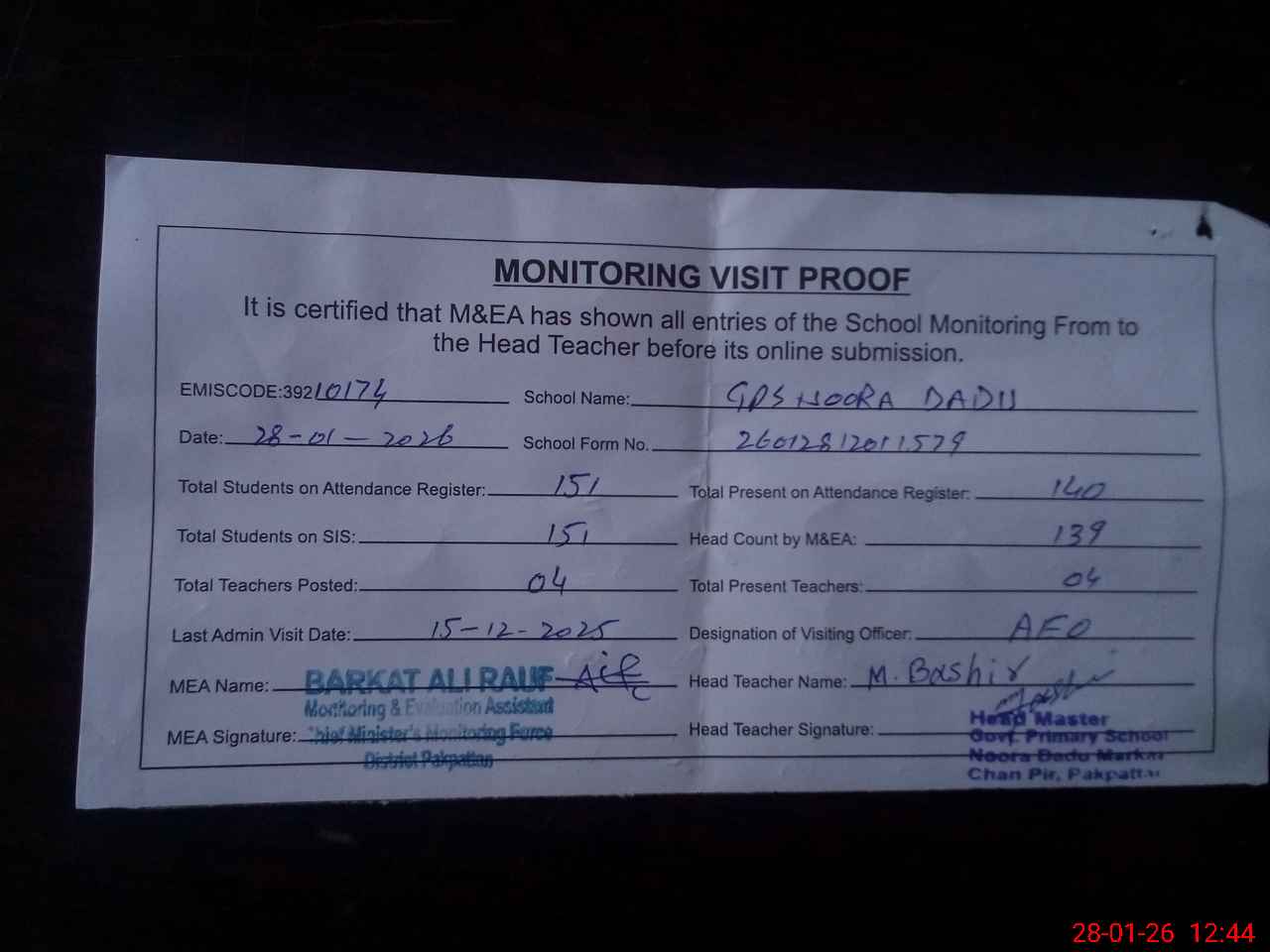 | Attendance Register | Head Teacher | MEA with School | Visit Proof |