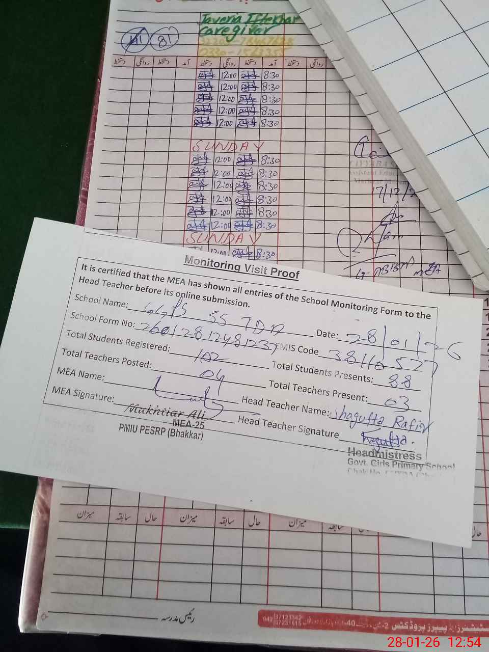 | Attendance Register | Head Teacher | MEA with School | Visit Proof |
