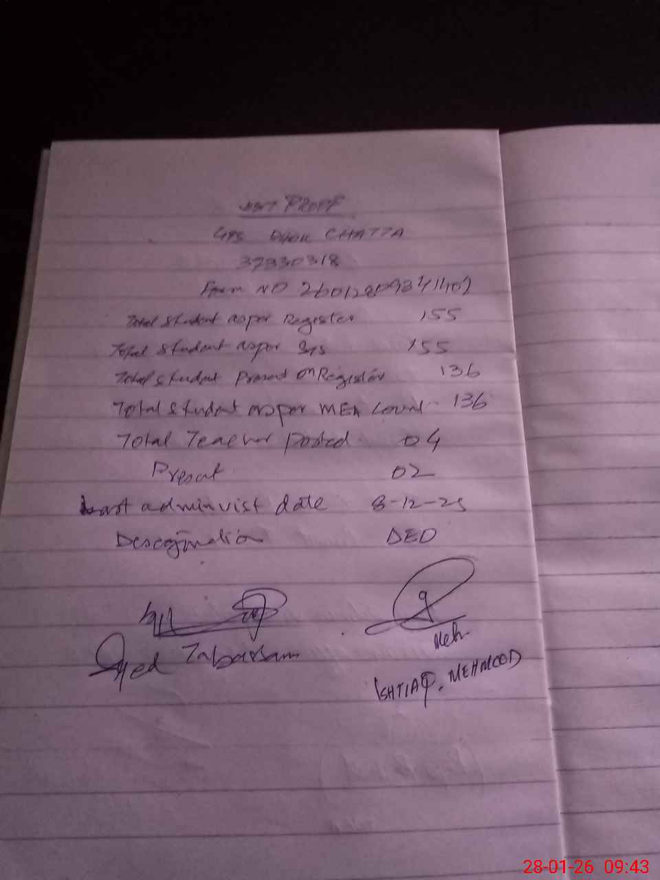 | Name: Is**** Me**** Designation: (School Headmaster's/Headmistress's) PST Phone/Cell Number: 03**** |