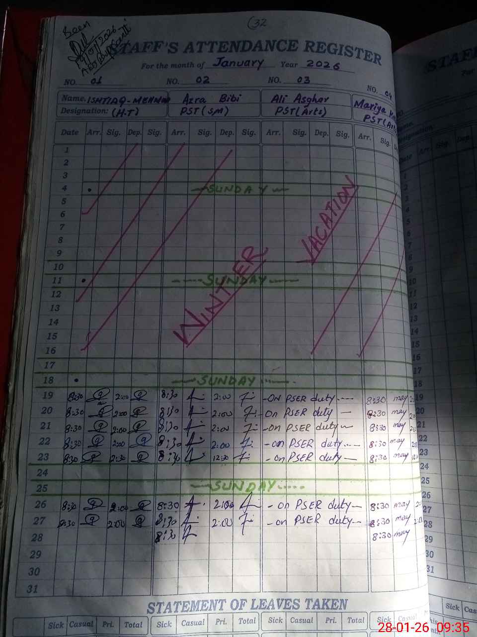 | Leave | Duty | Absent | Maternity | Medical | Ex- Pak |