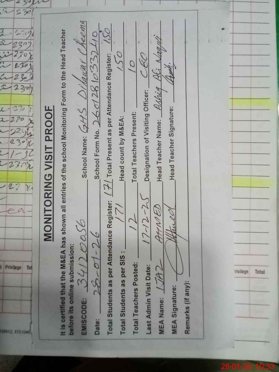 | Attendance Register | Head Teacher | MEA with School | Visit Proof |