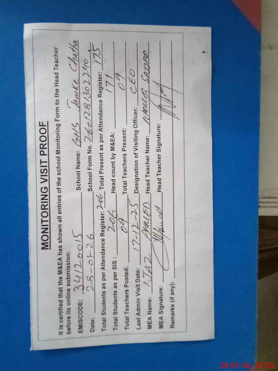 | EMIS Code: 34120015 | Name of School: GHS JAMKAY CHATHA | |||