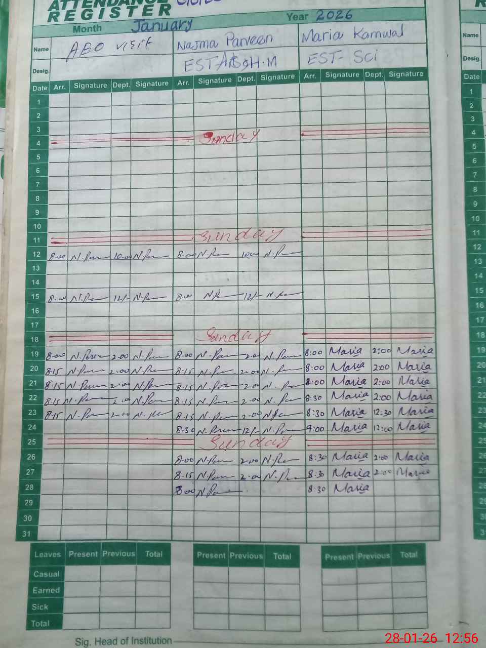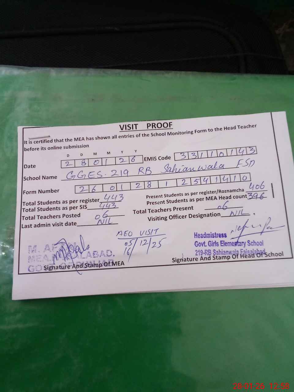 | Attendance Register | Head Teacher | MEA with School | Visit Proof |