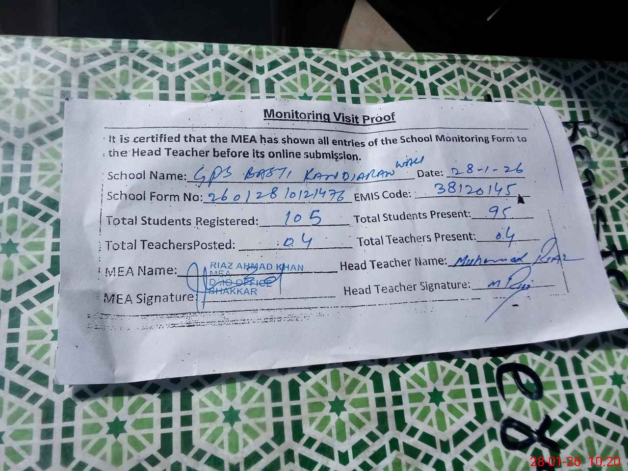 | Attendance Register | Head Teacher | MEA with School | Visit Proof |