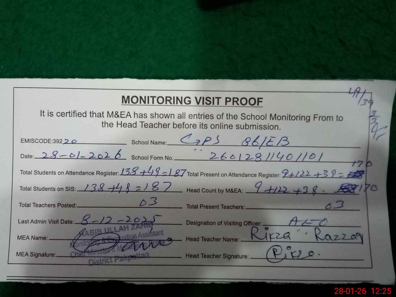 | Attendance Register | Head Teacher | MEA with School | Visit Proof |