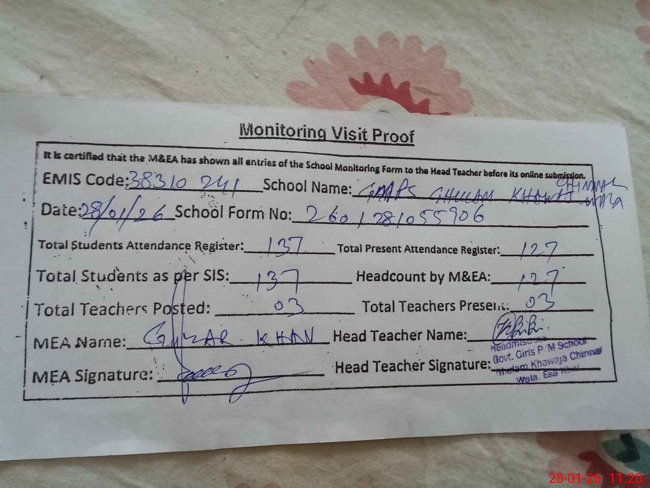 | Attendance Register | Head Teacher | MEA with School | Visit Proof |