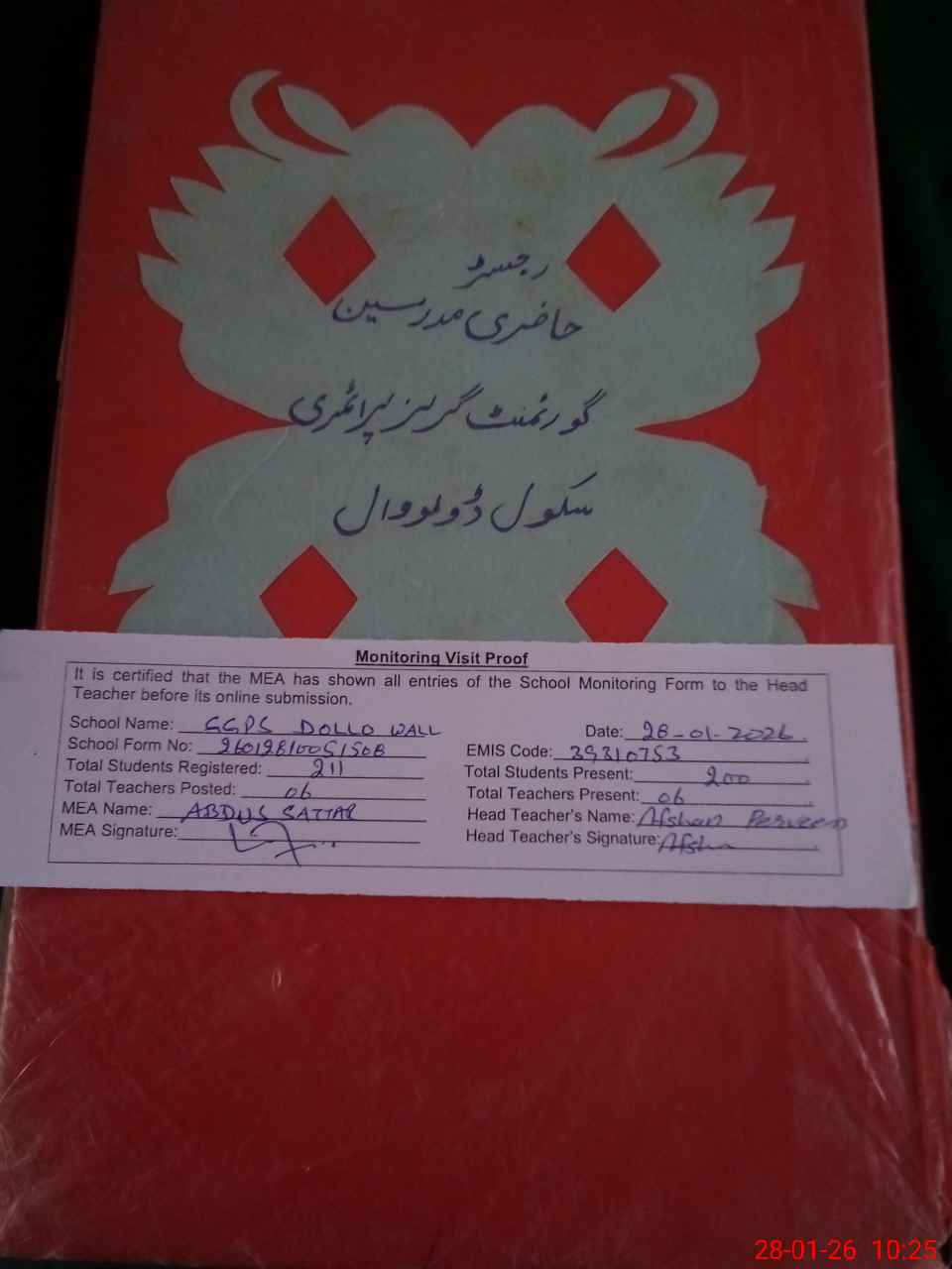 | Attendance Register | Head Teacher | MEA with School | Visit Proof |