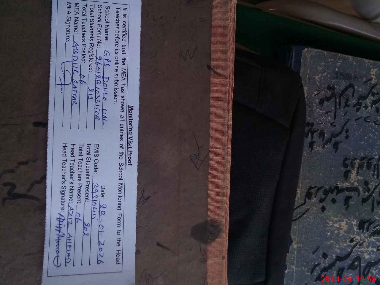 | Attendance Register | Head Teacher | MEA with School | Visit Proof |