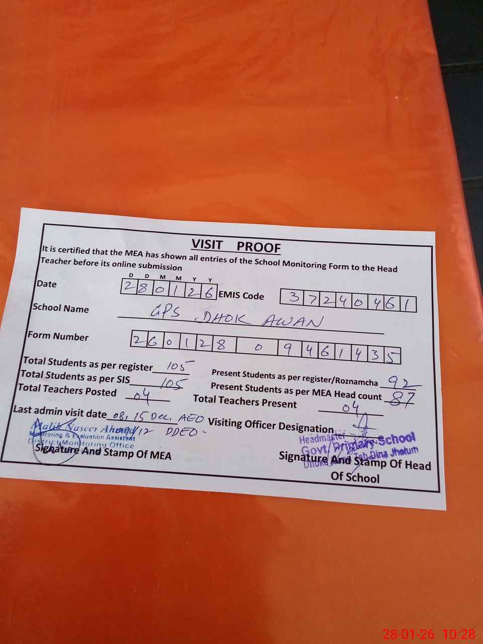 | EMIS Code: 37240461 | Name of School: GPS DHOK AWAN | |||
