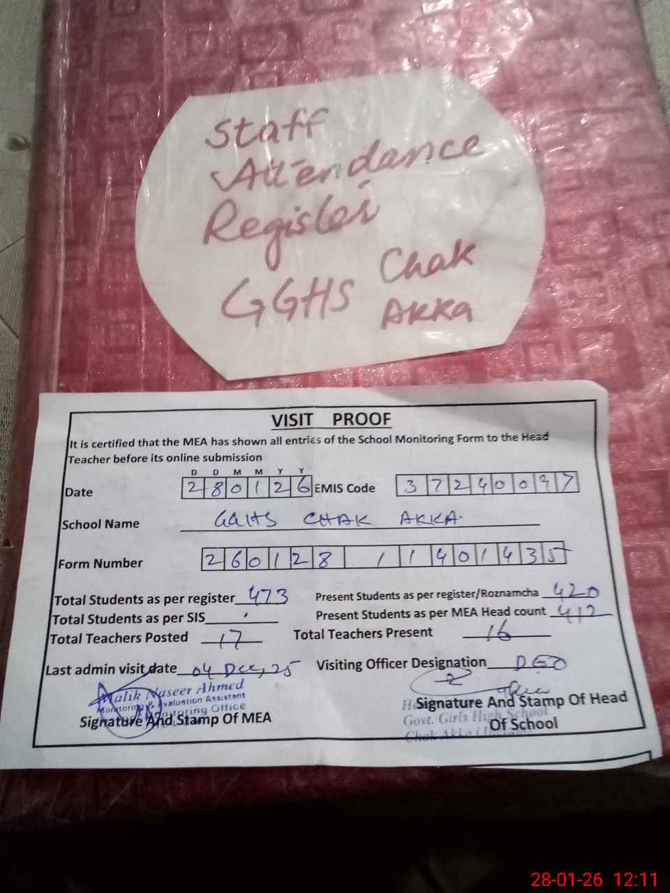| Attendance Register | Head Teacher | MEA with School | Visit Proof |