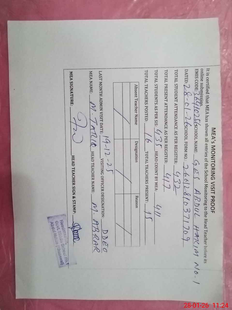 | Attendance Register | Head Teacher | MEA with School | Visit Proof |