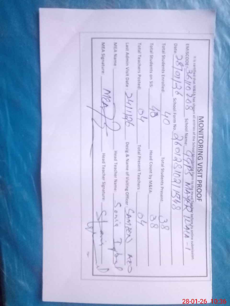 | Attendance Register | Head Teacher | MEA with School | Visit Proof |