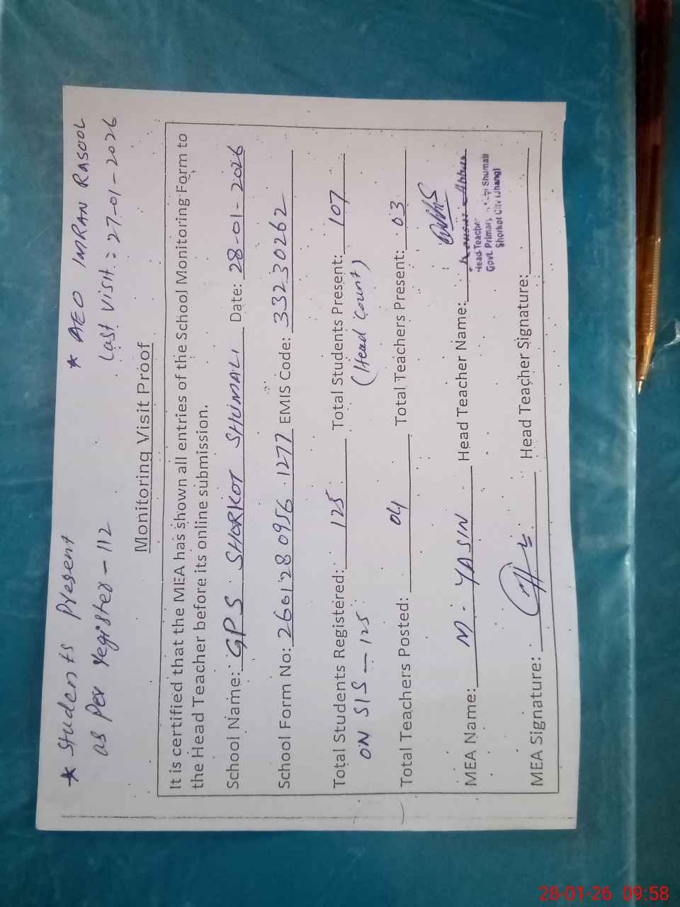 | EMIS Code: 33230262 | Name of School: GPS SHORKOT SHUMALI | |||