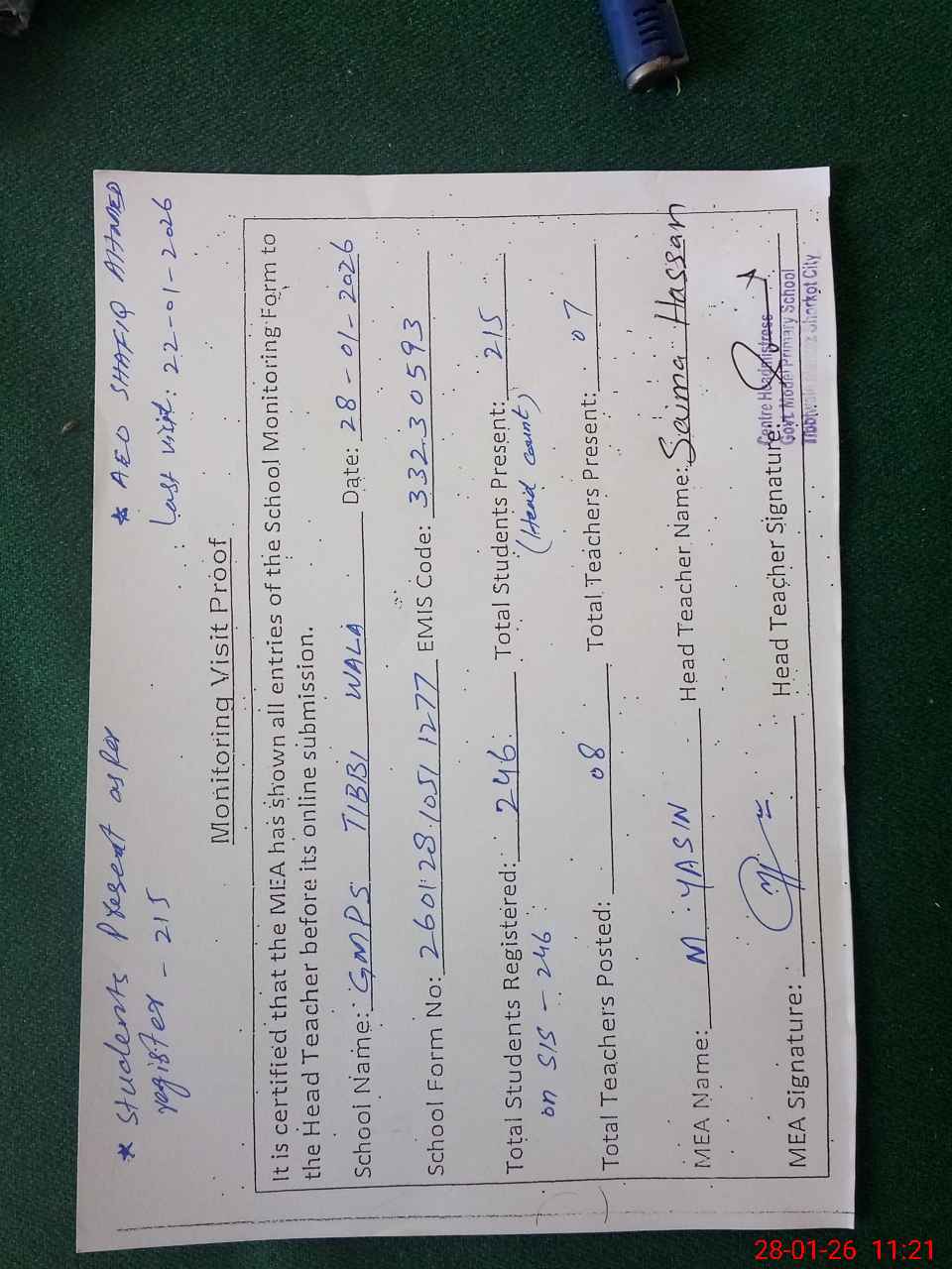 | Attendance Register | Head Teacher | MEA with School | Visit Proof |
