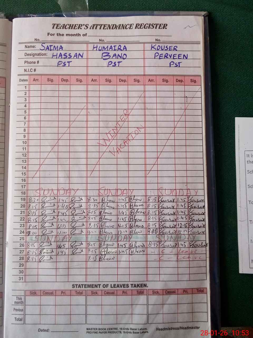 | Leave | Duty | Absent | Maternity | Medical | Ex- Pak |