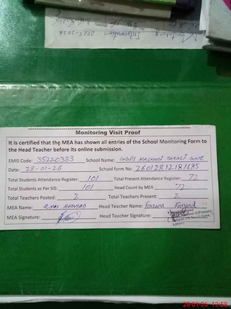 | Attendance Register | Head Teacher | MEA with School | Visit Proof |