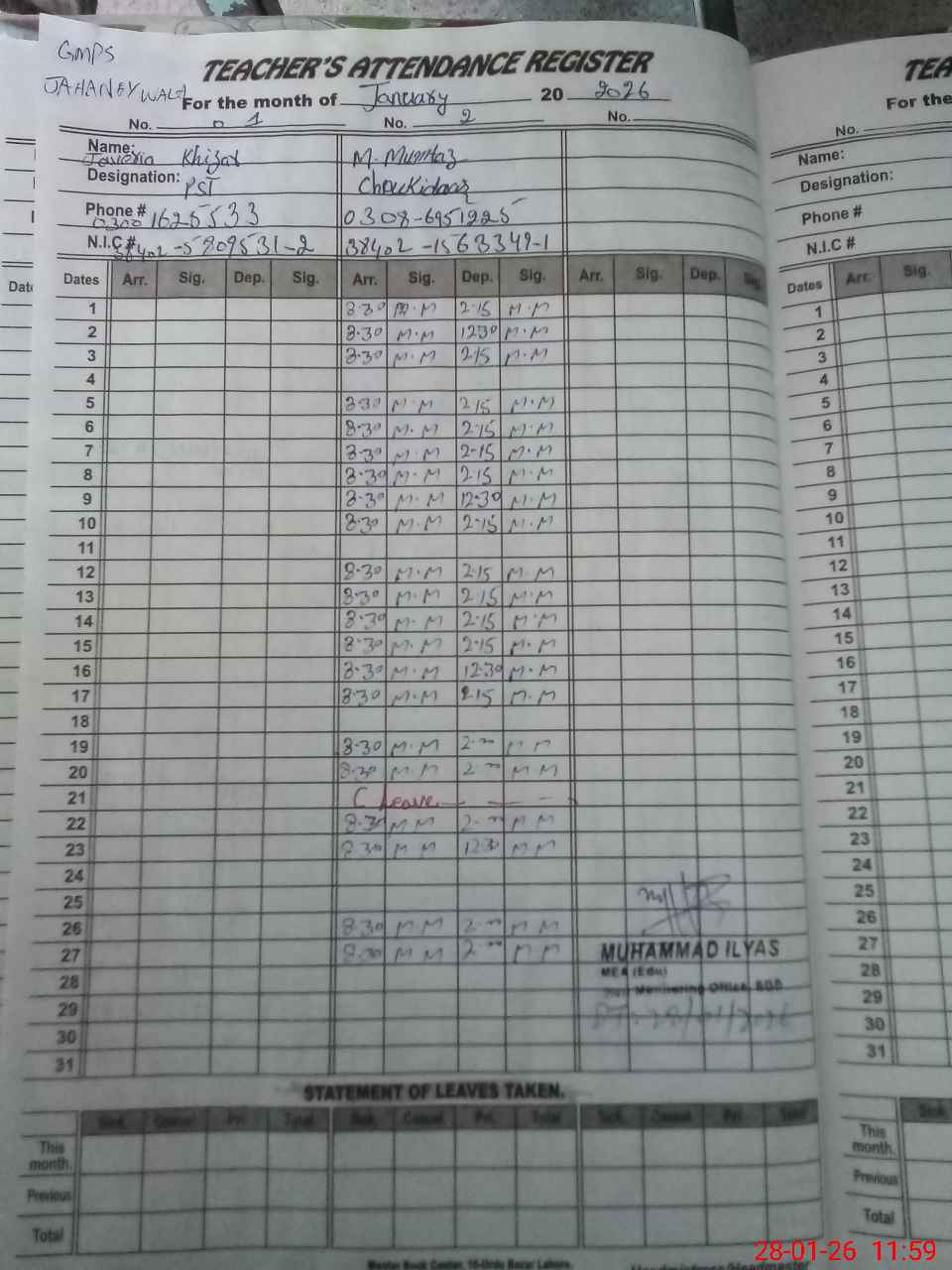 | Remarks (Use Separate Page if Required): JAVERIA KHIZAR PST CNIC NO 3840258095312 FOUND UN AUTHORIZED ABSENT HOWEVER 02 NSB TEACHERS ARE PRESENT IN SCHOOL MUHAMMAD MUMTAZ CHOWKIDAR CNIC NO 3840215633491 WAS ATTACHED IN SCHOOL AND FOUND UN AUTHORIZED ABSENT NSB AND FTF ACCOUNTS WERE NOT UPDATED TEXTBOOKS RECORD WAS NOT AVAILABLE | |||||
