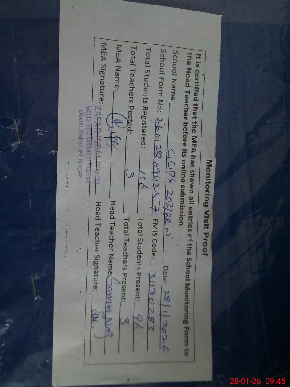| Monitoring Date: 28-01-2026 | Start Time: 28-01-2026 09:33 AM | End Time: 28-01-2026 09:46 AM | Name of MEA: Za**** Iq**** BN**** | |