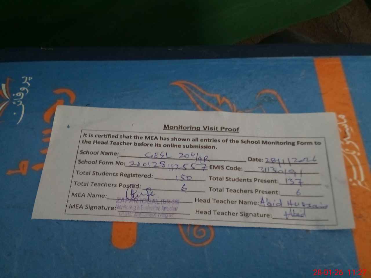 | EMIS Code: 31130191 | Name of School: GES CHAK NO. 204/9-R | |||