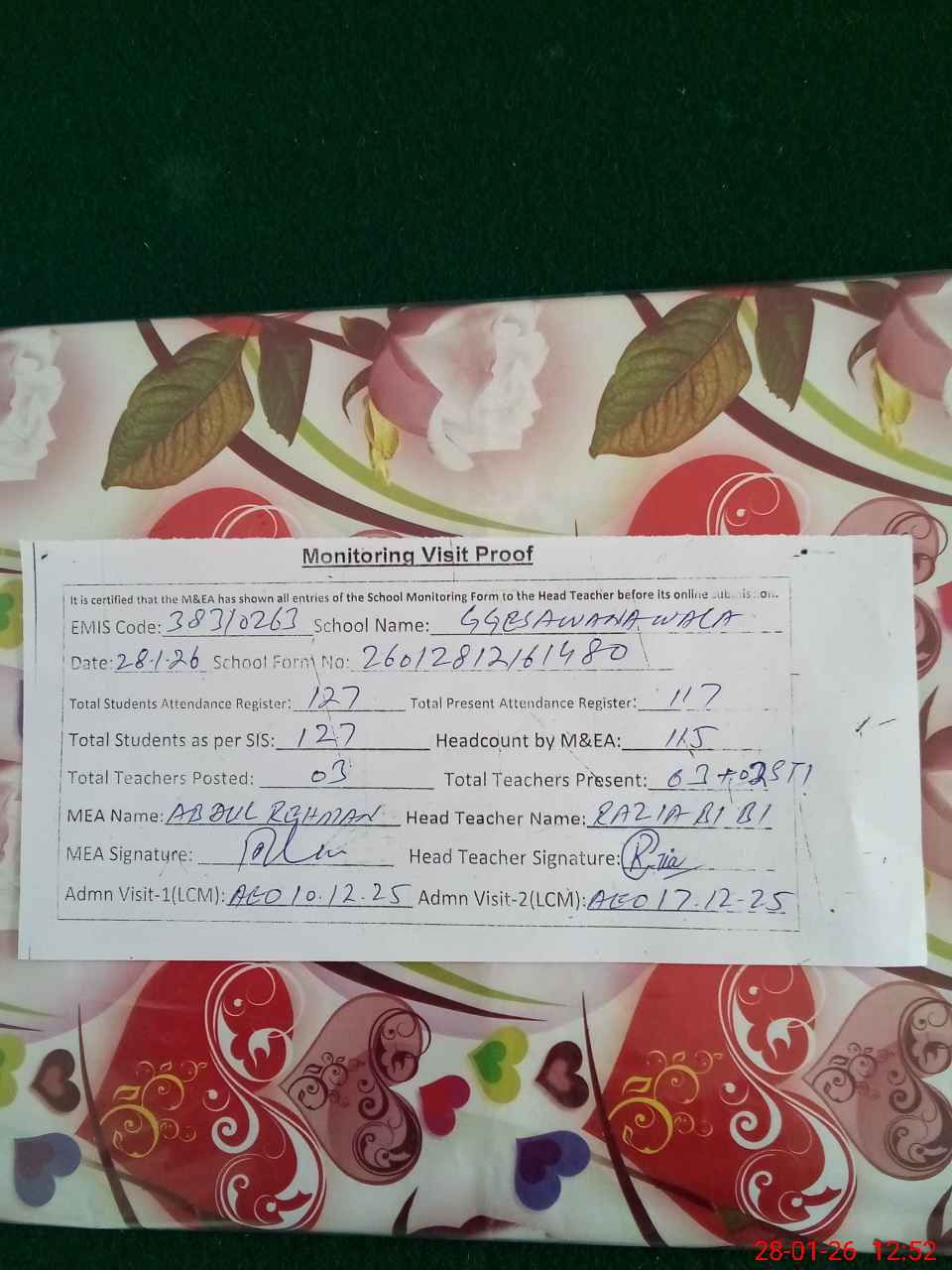 | Attendance Register | Head Teacher | MEA with School | Visit Proof |