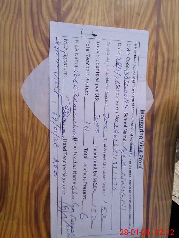 | Attendance Register | Head Teacher | MEA with School | Visit Proof |