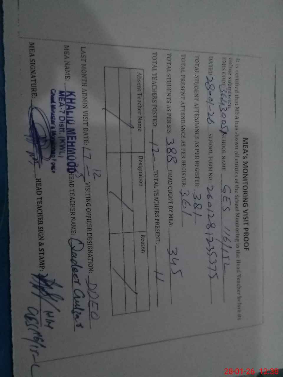 | Attendance Register | Head Teacher | MEA with School | Visit Proof |