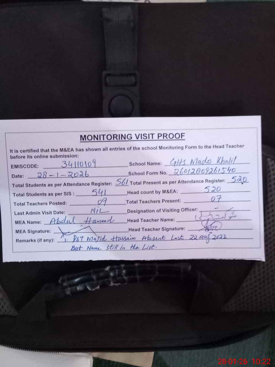 | Attendance Register | Head Teacher | MEA with School | Visit Proof |
