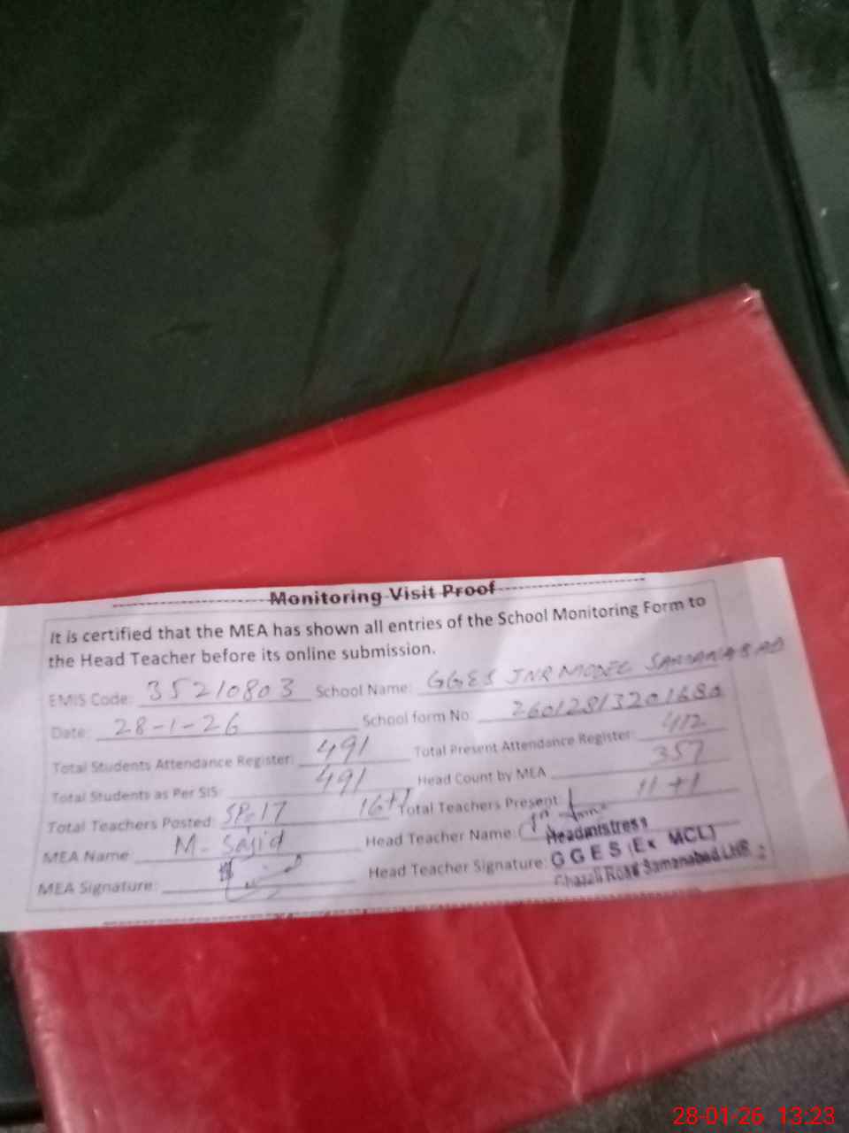 | Attendance Register | Head Teacher | MEA with School | Visit Proof |