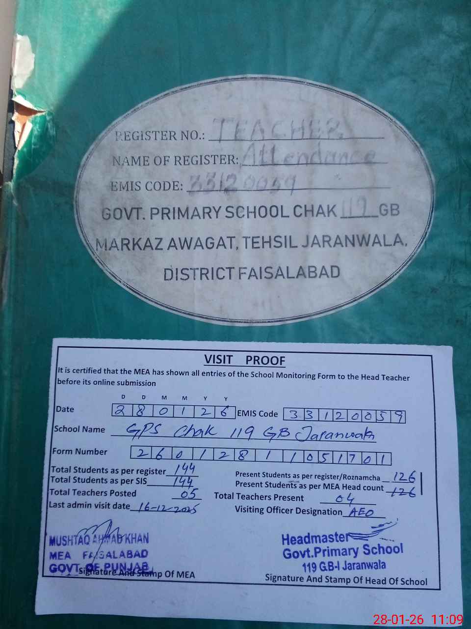 | Attendance Register | Head Teacher | MEA with School | Visit Proof |