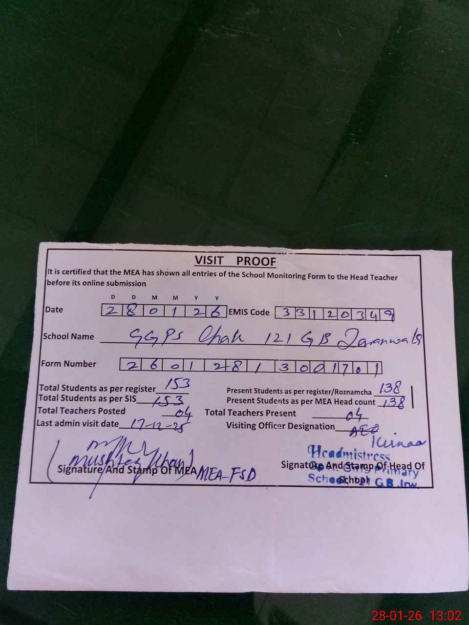 | EMIS Code: 33120349 | Name of School: GGPS CHAK 121 GB JARANWALA | |||