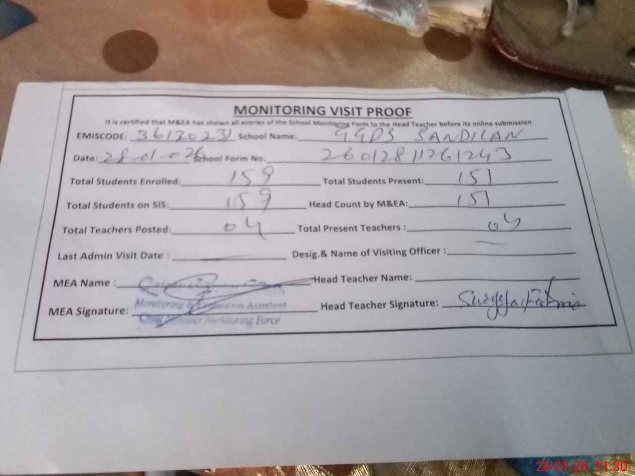 | Attendance Register | Head Teacher | MEA with School | Visit Proof |