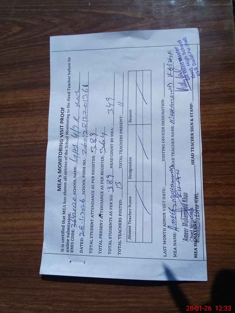 | Attendance Register | Head Teacher | MEA with School | Visit Proof |