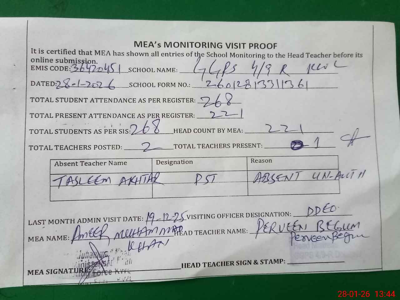 | Monitoring Date: 28-01-2026 | Start Time: 28-01-2026 12:40 PM | End Time: 28-01-2026 01:54 PM | Name of MEA: Am**** Mu**** Kh**** | |