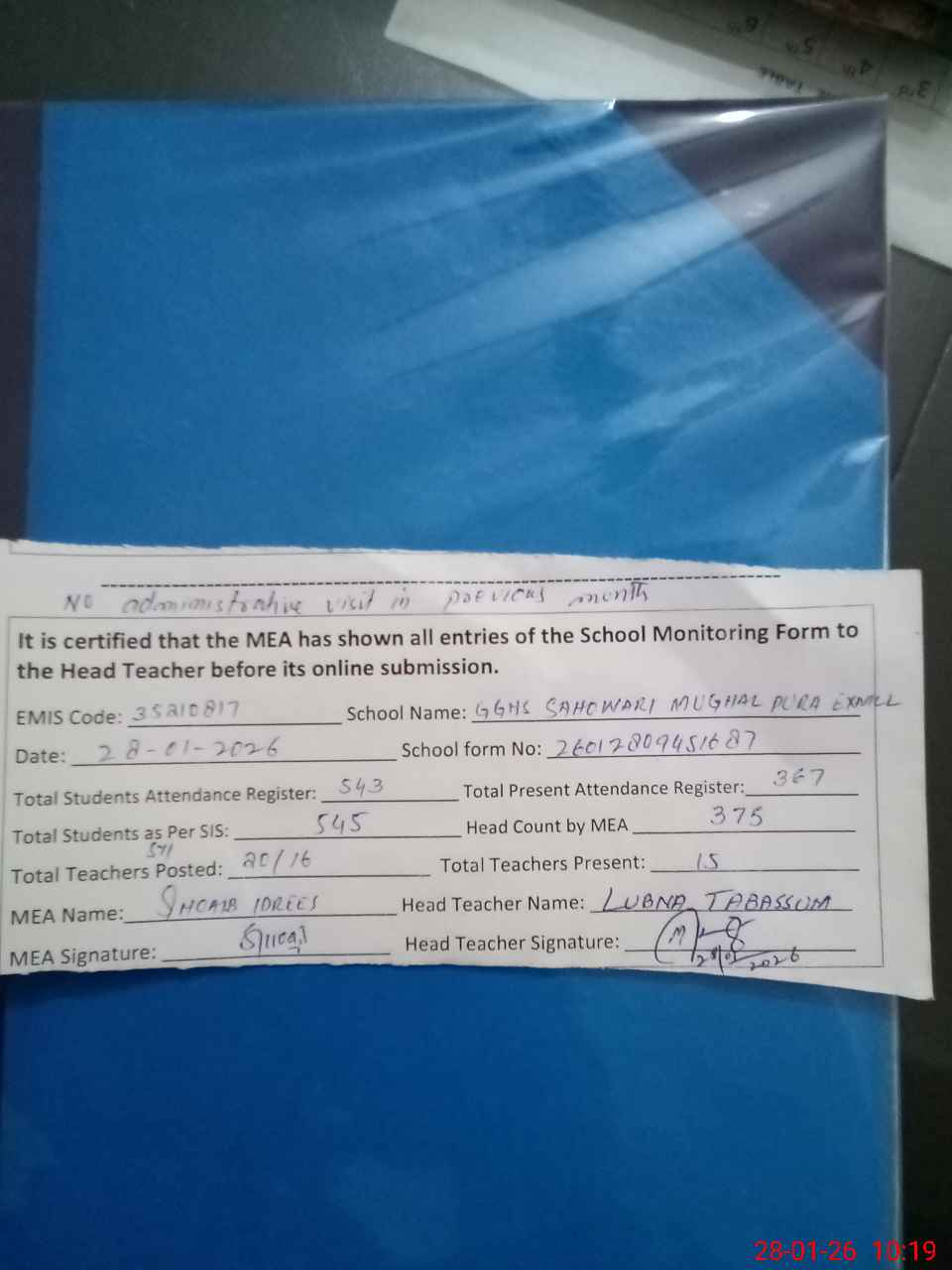 | Attendance Register | Head Teacher | MEA with School | Visit Proof |