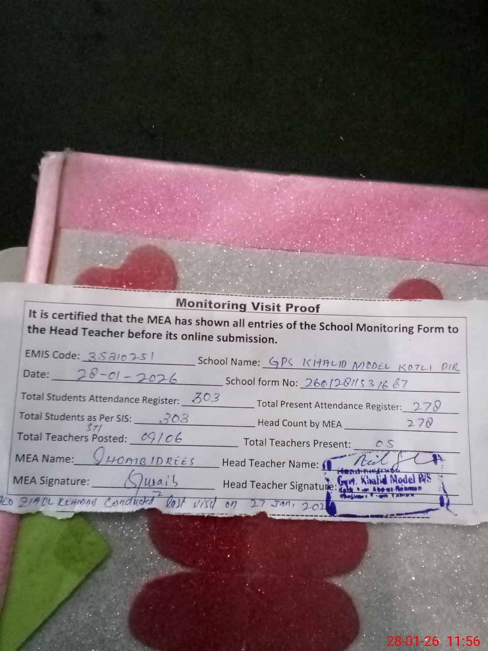 | Attendance Register | Head Teacher | MEA with School | Visit Proof |