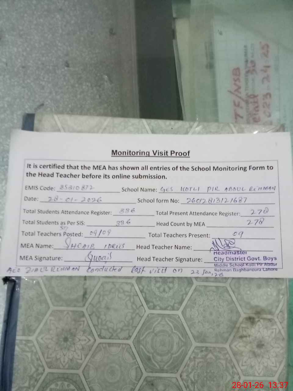 | EMIS Code: 35210872 | Name of School: GES KOTLI PIR ABDUL REHMAN (EX-MCL) | |||