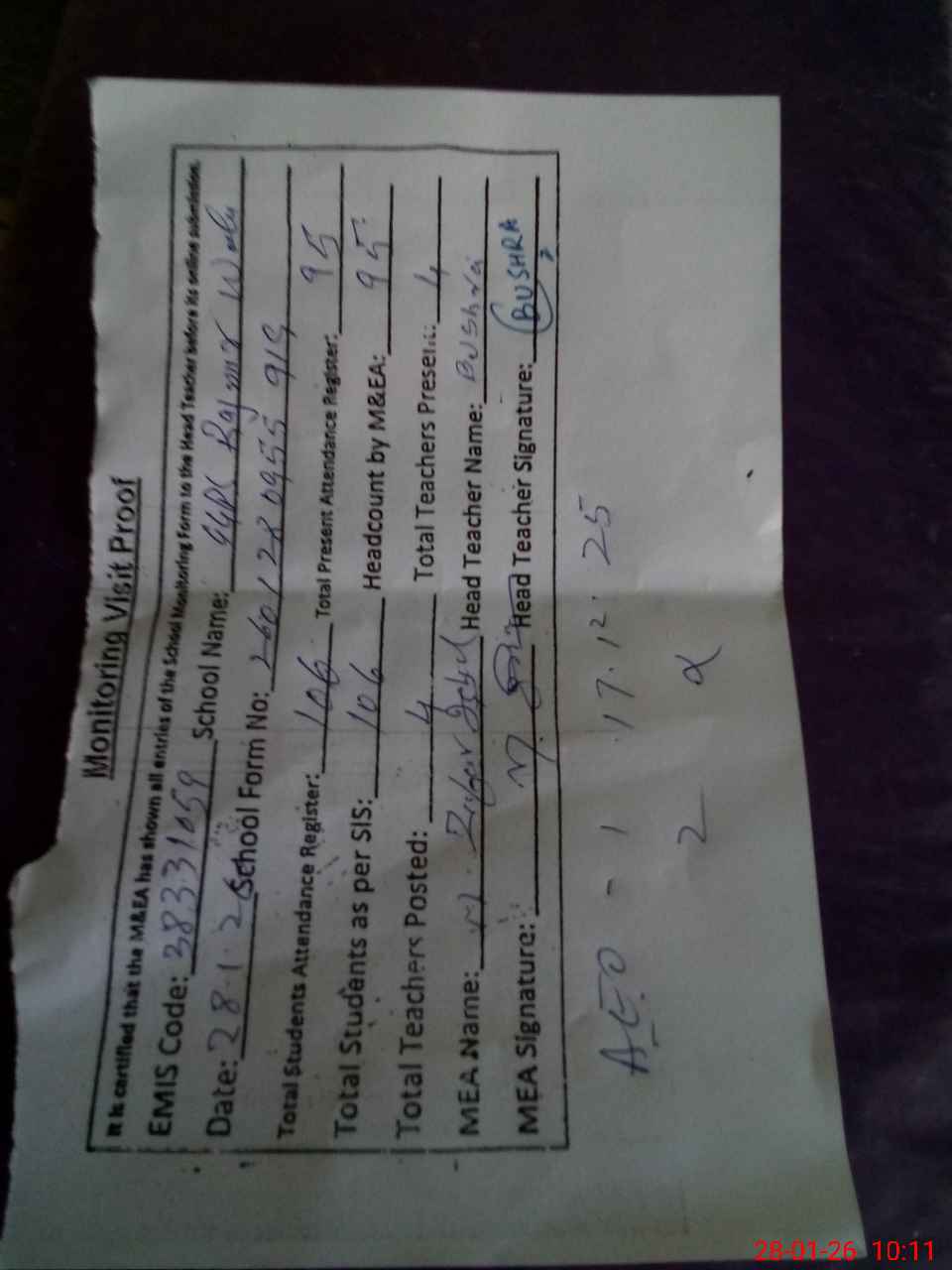 | Attendance Register | Head Teacher | MEA with School | Visit Proof |
